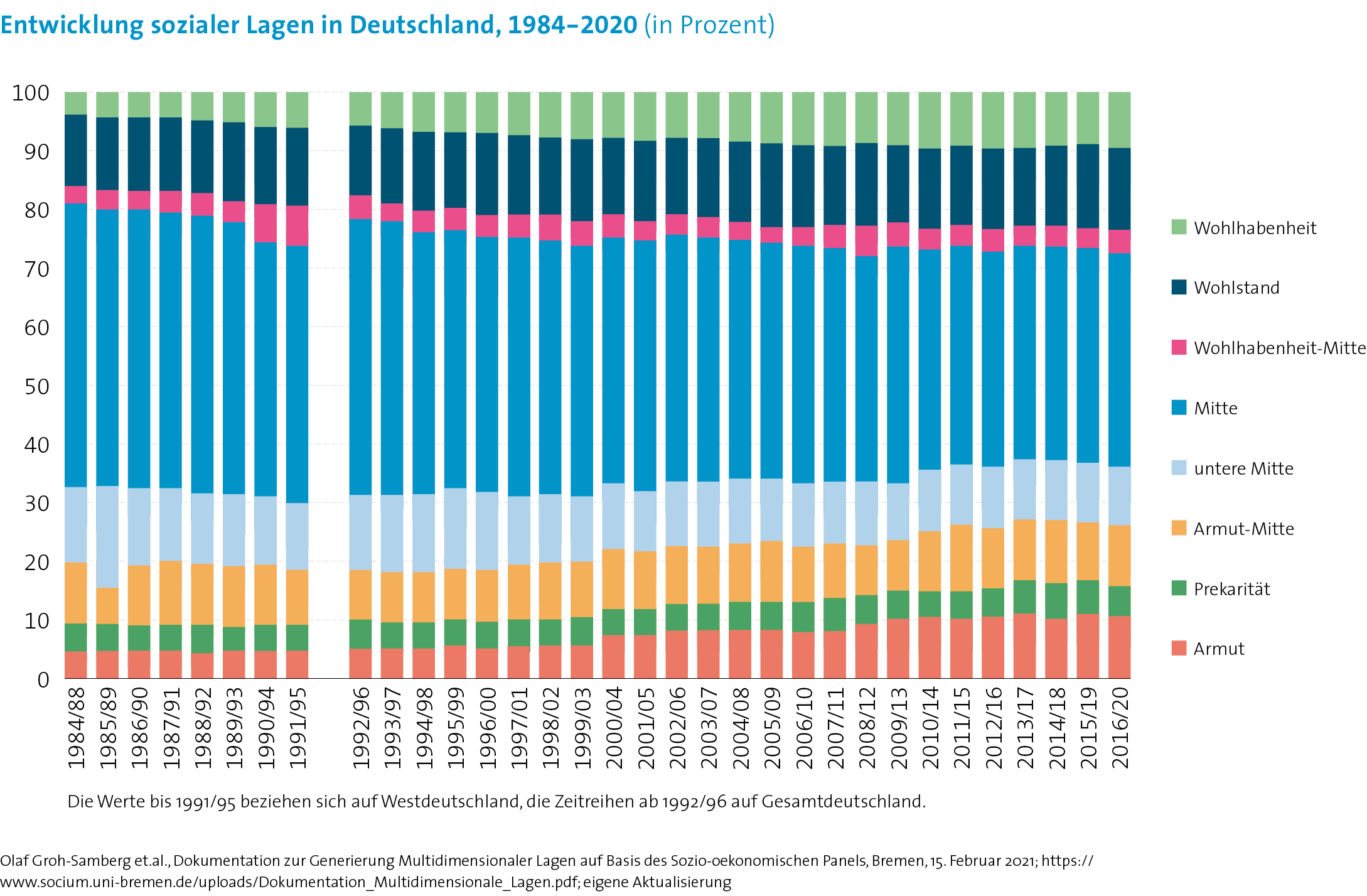 Entwicklung sozialer Lagen in Deutschland, 1984-2020 (in Prozent) (© Olaf Groh-Samberg et.al., Dokumentation zur Generierung Multidimensionaler Lagen auf Basis des Sozio-oekonomischen Panels, Bremen, 15. Februar 2021; https:// www.socium.uni-bremen.de/uploads/Dokumentation_Multidimensionale_Lagen.pdf; eigene Aktualisierung)